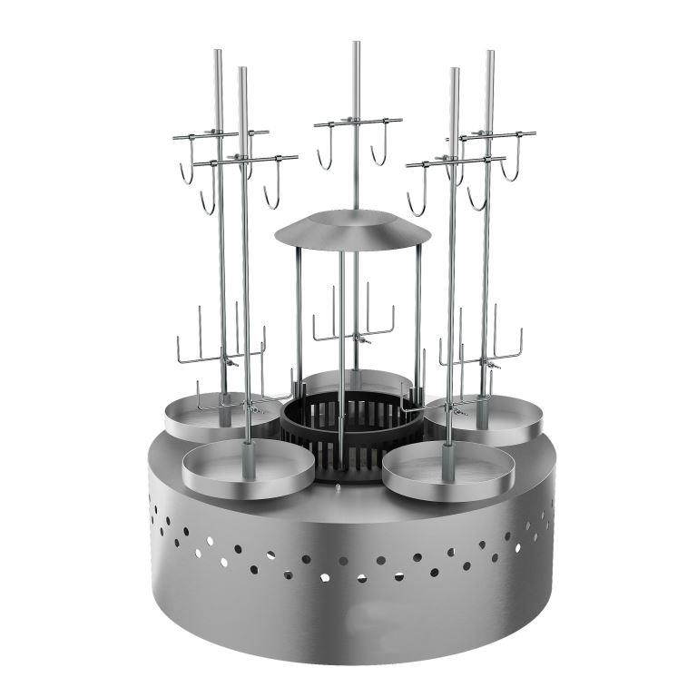 Literally translated Fogo de Chao means ” fire on the ground”. This BBQ is used to slow roast primal cuts of beef ribs around a central wood fire. Each of the 5- 40 inch long skewers rotates independently for perfect even cooking. A drip pan at the base of each skewer keeps things tidy. Skewer cross arms are fully adjustable to accommodate any cut and type of meat. Just close your eyes and visualize for a moment.
